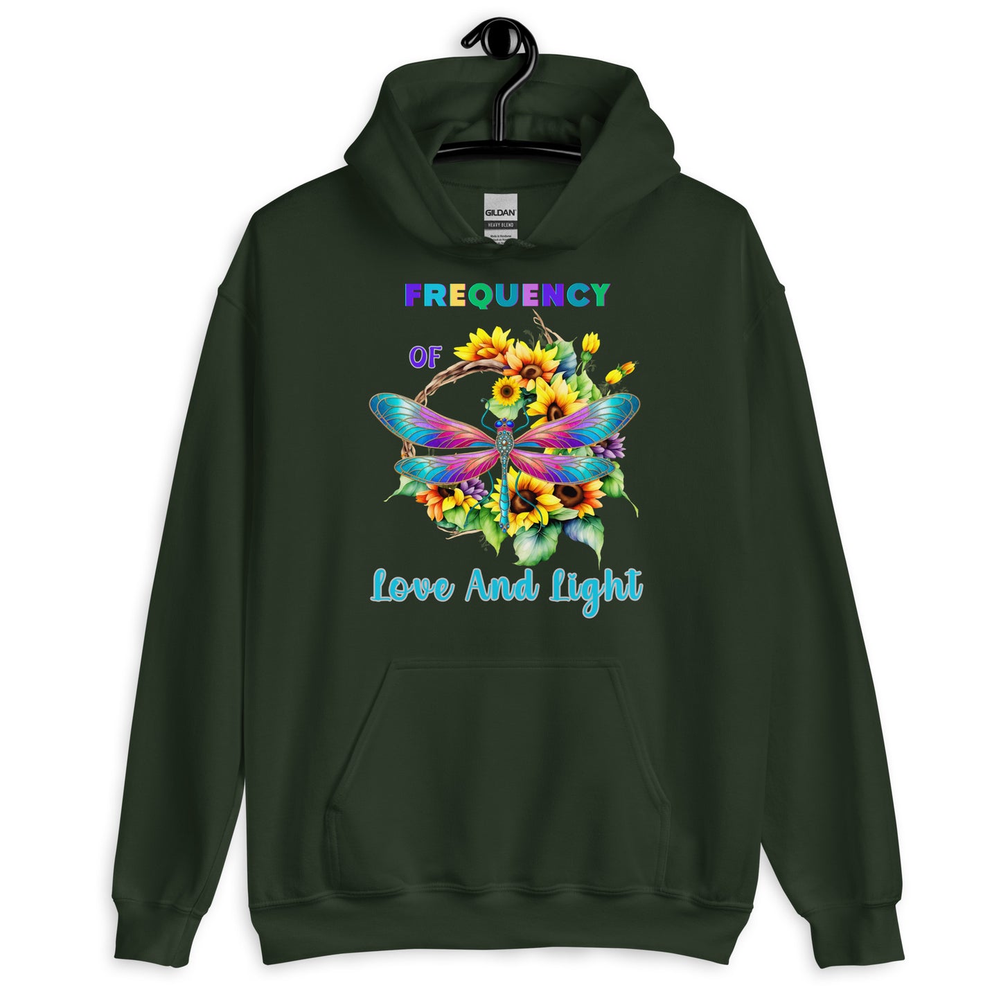 Hoodie – “Frequency of Love and Light” – Spiritual Dragonfly & Sunflower Front Print, Transformation & Healing Vibes